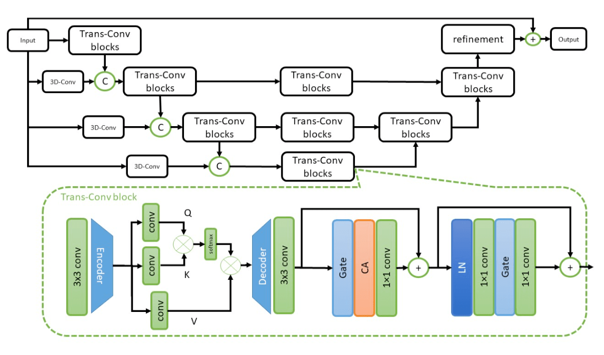 수치: 제안된 하이브리드 변압기의 구조 – 컨볼루셔널 난류 완화 게이션 모델(HATM). CA와 LN은 채널 주의와 계층 정규화를 나타내며, 각기.